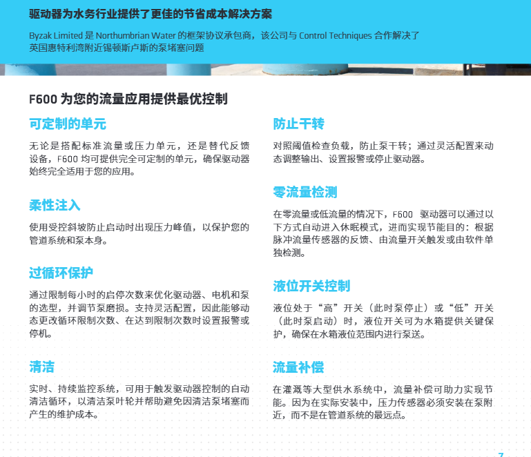 涉及水流的應用,需要極高的可靠性和低能耗。Control Techniques 的F600驅動器隸屬于新推出的行業專用系列,基于我們五十年的驅動專業知識打造,可提供可靠的流量控制。F600驅動器功能齊全,匯集了您所需的一切功能,而且功能說明通俗易懂。它并非附帶泵功能的通用驅動器,而是一種專用泵專用驅動器。 F600采用全新設計,可提供您所需的可靠性和效率.