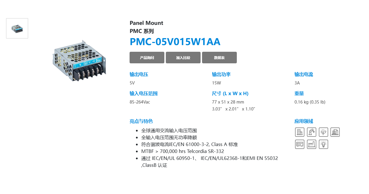 功率因素 115VAC 符合 EN 61000-3-2 > 0.99 > 0.98