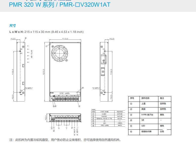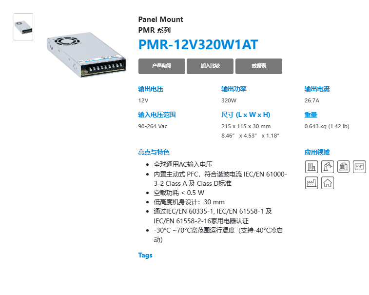 | 輸出 | PMR-12V320W1AT | PMR-24V320W1A | PMR-36V320W1AT | PMR-48V320W1AT | |