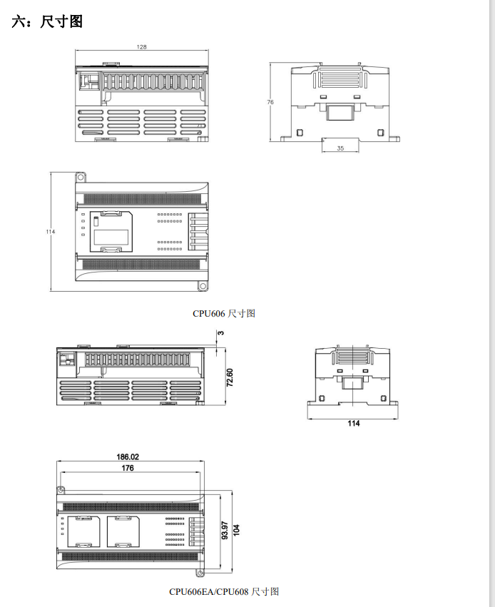 | DC 24V | AC 220V | DI | DO | AI | AO | 擴展BD槽 | 高速輸入 | 高速輸出 | 通訊口 | 擴展模塊 | 外形尺寸(單位: mm(長) |