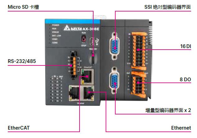 ● 內置6?~?16 DI?/?6?~?8 DO、增量型編碼器、SSI編碼器、RS-232/422?/?485、Ethernet與EtherCAT等界面